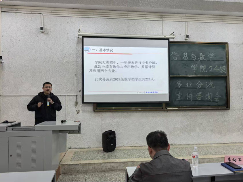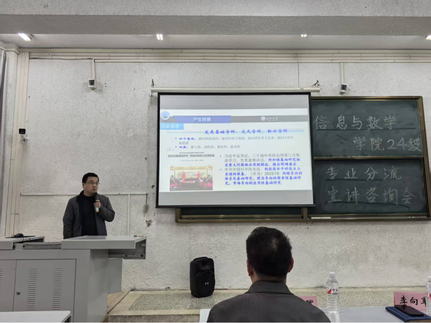 (通讯员 于志浩)4月2日,365英国官网在365英国上市公司官网西校区5教103室举办2024级本科生专业分流宣讲会。参加本次会议的有分管教学副院长李向军、院长助理邹健、数学与应用数学系主任严政,会议由辅导员吴朝晖主持。本次会议旨在帮助24级学生深入了解数学类各专业特色,科学合理地选择专业,明确发展方向。