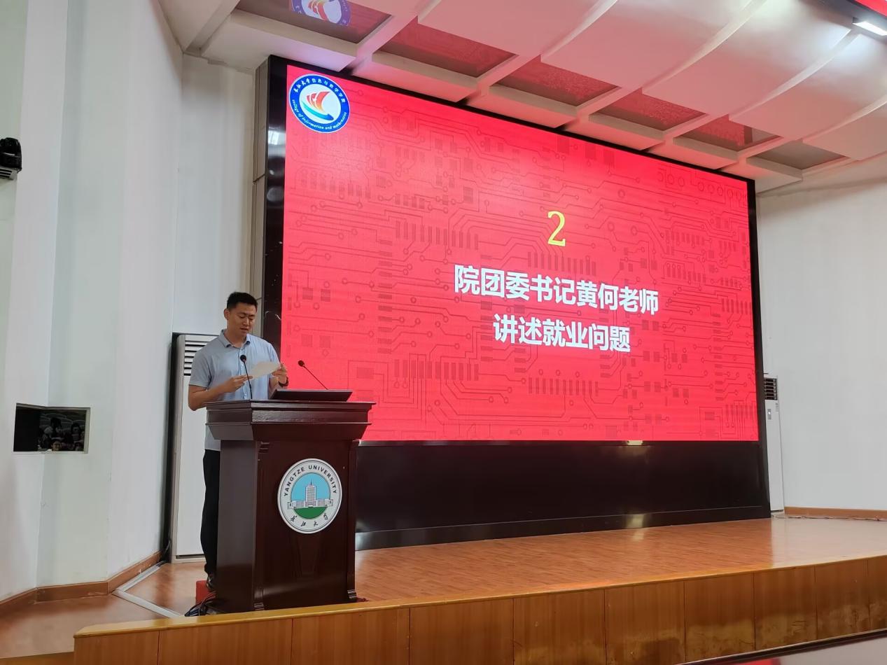 在老师们发言环节,黄何老师通过分析当前就业形势,结合学院近三年毕业生就业大数据,为同学们给出就业参考和建议。姜曼老师通过真实案例警示片,重点剖析电信诈骗、租房陷阱、职场维权等毕业生高频风险点,提醒同学们不轻信、不透露、不转账。最后谷军老师寄语,他希望同学们在未来的人生道路上,能够始终保持对真理的追求,坚守理想信念,勇担时代使命,以积极乐观的态度面对挑战,在各自的领域发光发热。