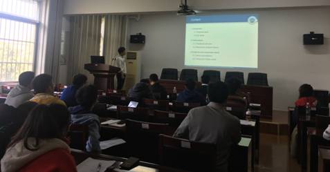 2017级李政同学汇报的主题是:群体智慧引导的演化算法的设计应用与研究,其主要成果为在原始BSA的变异过程中加入最优个体和平均个体的集体智慧引导,以此提高原始算法的局搜索能力和鲁棒性。2017级张亚同学汇报的内容是基于稀疏重构模型的加速分割bregman算法研究,研究结果为针对L1范数的稀疏模型,将Nesterov加速梯度方法与分割Bregman迭代算法结合,提出一种加速分割 Bregman迭代算法。仿真实验验证新算法的快速收敛速率得到明显提高。2017级湛文涛同学汇报的主题是:Sobolev-type Fractional Stochastic Differential Equations,其研究结果为运用Picard迭代技术证明由分数布朗运动驱动的分数阶sobolev型随机微分方程的温和解的存在唯一性等等。