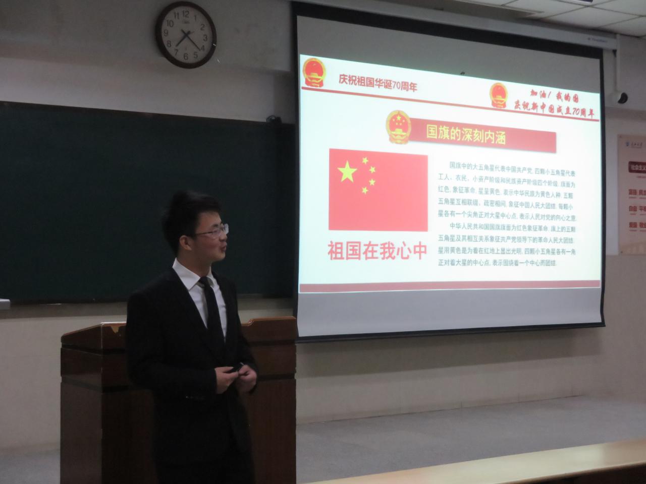 (通讯员 王楚楠)弘扬爱国奋斗精神,建功立业新时代。10月20日晚7:00,365英国官网在东校区12教202教室开展“庆祝新中国成立70周年”学习活动,2016级、2018级本科生参加。本次学习活动由2018级应用数学专业研究生沈马锐主讲。
