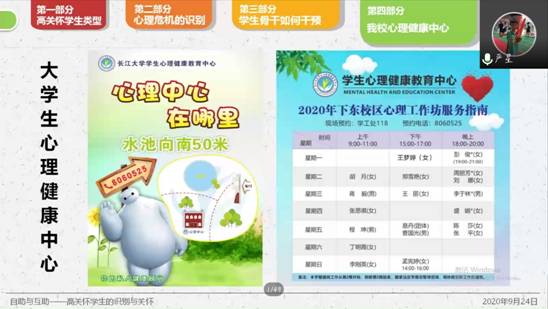 严老师主要从高关怀学生类型、心理危机的识别、学生骨干如何干预、我校心理健康中心这四方面展开。