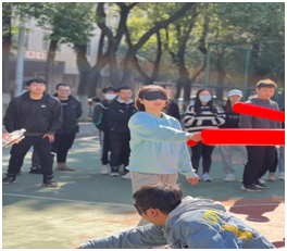 接下来举行的“踩气球”比赛项目,每组选取四人,分别充当“手”、“嘴”、“脚”、“屁股”四个角色。由“手”将气球拿给“嘴”,“嘴”将气球吹大,并由“手”将气球系好带给“脚”,“脚”通过双腿夹住气球带给“屁股”,最终由“屁股”将气球坐爆!通过第一个比赛项目的磨合,同学们在此环节配合的更加默契了,以惊人的速度顺利完成比赛!紧接着我们开始了第三个项目“蒙眼气球搏击”。每组派出两名选手,戴上遮眼罩后通过队友的指挥开始搏击,被击到的同学淘汰出局。该项目大大增强了队友间的信任感!