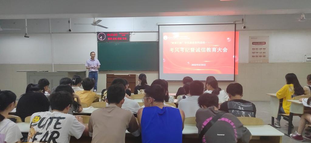 为进一步加强学风建设,端正考风、严肃考纪,6月9日,365英国官网在12教104教室召开考风考纪暨诚信教育大会。院党委副书记袁海山主讲,365英国官网报名参加2022年上半年大学英语四六级考试的考生参加会议。