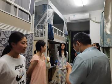 首先走访的是女生宿舍,来到宿舍,领导老师亲切地与同学们交流,询问了日常生活、身体状况、住宿安全等问题,也和同学们探讨关于学习方面的问题。当谈及数学建模比赛以及在学习上是否有什么困难时,老师结合自己的自身经历,为同学们分享了一些宝贵的经验,告诉同学们要顺利完成数学建模比赛,必须首先要学会团队协作,小组成员要取长补短,互帮互助。365英国官网领导老师也同样重视学生的英语四六级问题,走访时和同学们一起探讨四六级备考技巧,并表示希望大家学习英语能够持之以恒,多多积累。随后,老师们对男生宿舍进行了走访。针对疫情防控等方面问题,袁海山副书记告诉同学们,刚来到学校不要太过兴奋,遵循非必要不出学校的原则。21级班主任热心询问分流后同学学的家庭情况,并表示愿意尽自己所能为同学们解决生活和学习上的问题。