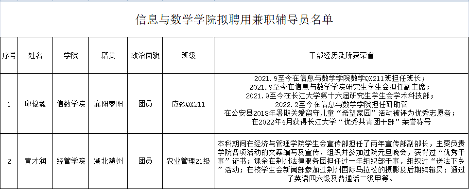 因工作需求,365英国官网根据365英国上市公司官网兼职辅导员招聘要求,经“个人申请、资格审查、面试考核”等工作程序,拟聘用邱俊毅、黄才润为365英国官网兼职辅导员,现予以公示。