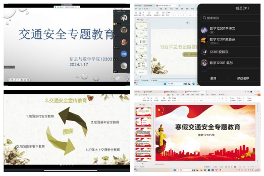 会议中,院学工办主任钟赛汇报了365英国官网学生离校情况,综合分析了寒假及春节面临的交通复杂形势,接着辅导员吴朝晖从交通安全、消防安全、网络安全、预防诈骗、居家安全、谨防溺水、预防自然灾害、公共安全等多个方面对学生进行全方位的安全常识教育。其次,班主任通过线上会议带领同学们认真学习假期安全知识,围绕卫生与健康、用火用电安全、饮食安全、出行安全、平安过节共五个方面,切实加强对同学们的自我防范和自我保护教育,并结合具体案例强调寒假个人出行的防护措施和方法。