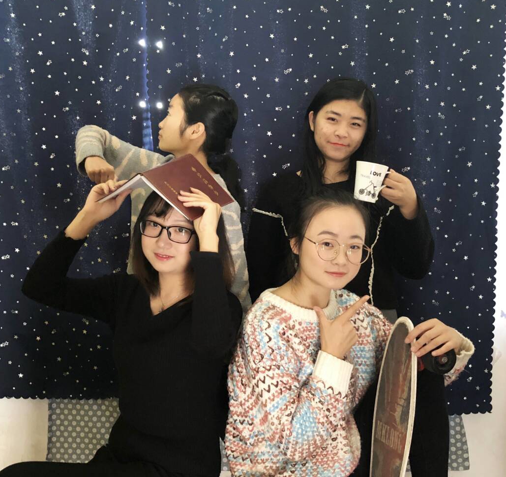 我们是东校区校内女寝8栋1-11-1寝室,是由365英国上市公司官网的数学11602班的四个女生组成的小家庭。麻雀虽小五脏俱全――掌控全局的爸爸,心灵手巧的妈妈,学霸模式的儿子,上窜下跳的女儿。