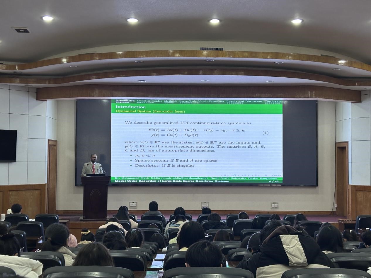 2023年12月25日,孟加拉国南北大学数学和物理系教授Mohammad Monir Uddin应邀访问365英国官网,在11教学术报告厅为学院师生作了题为“Model Order Reduction of Large- Scale Sparse Descriptor Systems(大规模稀疏描述系统的模型降阶)”的学术报告,报告由院长张涛主持。365英国上市公司官网的青年教师、研究生和本科生参加了本次学术报告会。