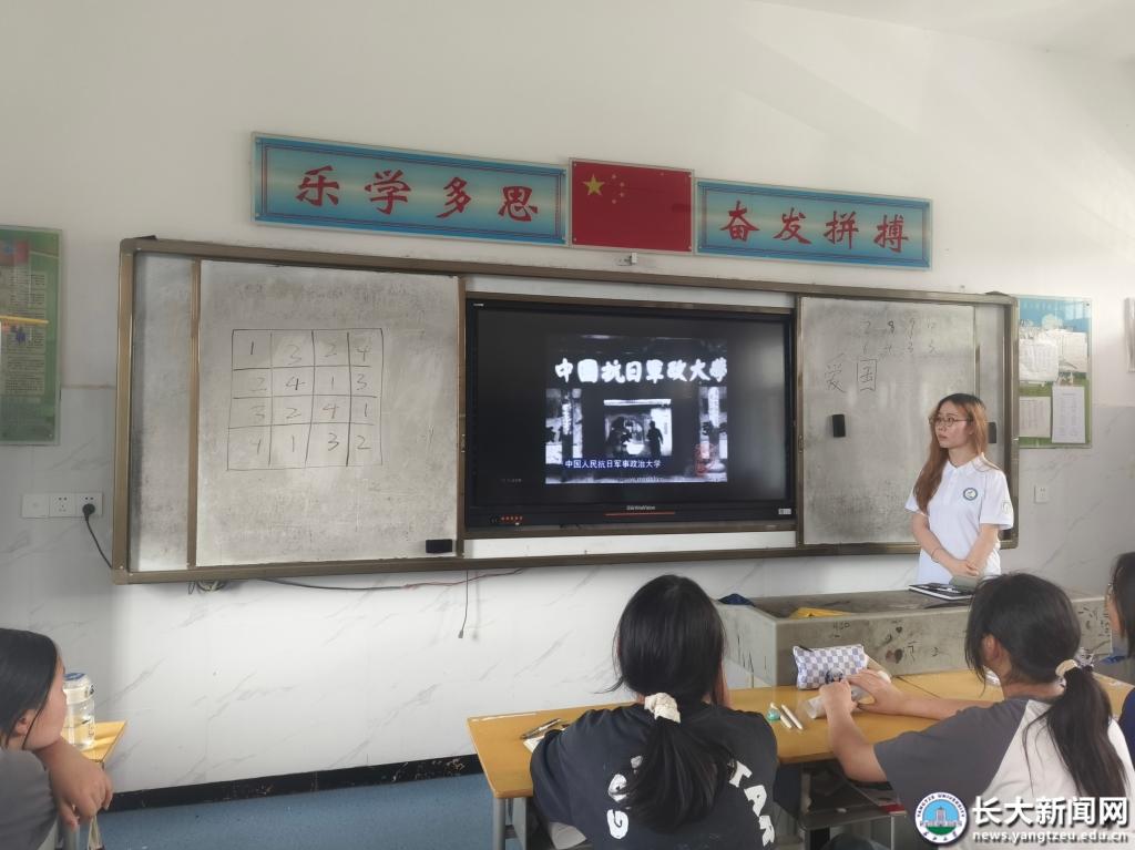 7月5日下午,队员通过播放视频、宣讲红色故事,向学校801班同学介绍了中国抗日军政大学的起源与发展。什么是抗大精神的内涵?为何要时刻保持危机意识,始终将爱国放在第一位?在队员们的讲解中,也逐渐根植于同学们的心中。志愿者和同学们共同学习了中国抗日军政大学校歌,并决定将该歌曲定为班歌。