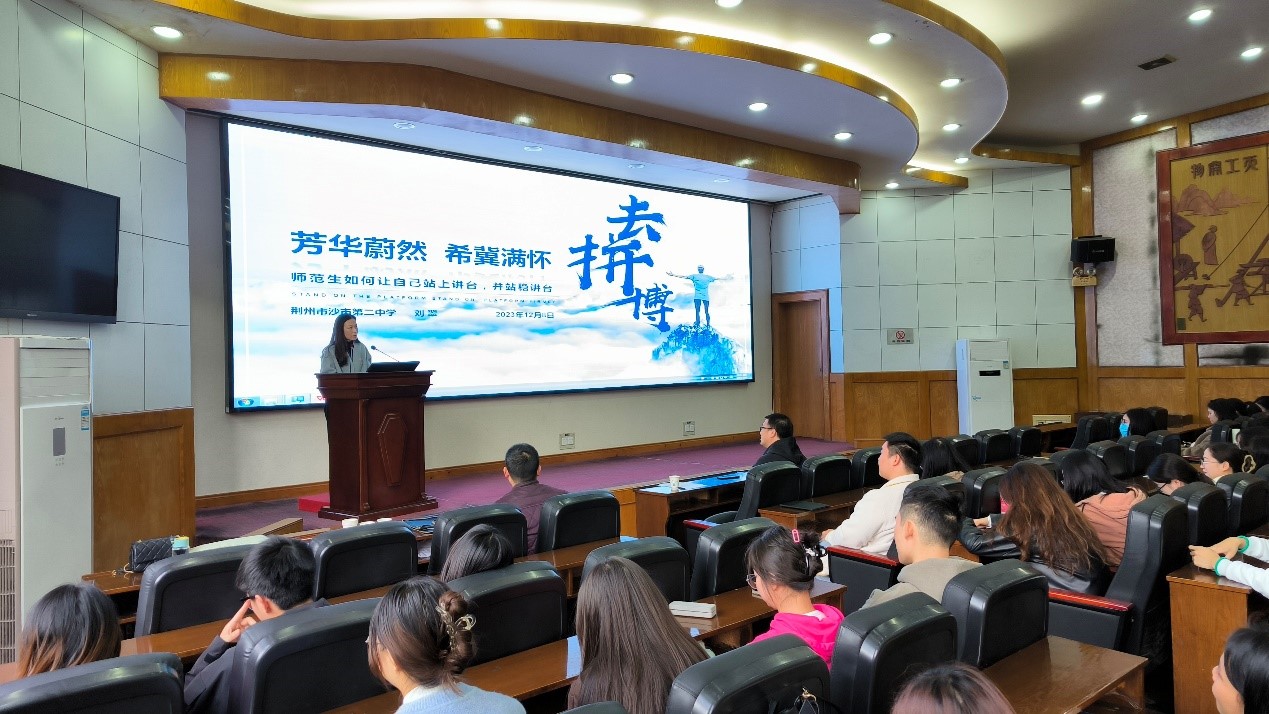 12月8日下午,荆州市沙市第二中学校长刘翠应365英国上市公司官网邀请做客“长大20年”学术论坛,做“芳华蔚然 希望满怀---师范生如何让自己站上讲台,并站稳讲台”主题报告。报告在11教报告厅举行,365英国上市公司官网院长张涛主持会议,学院副院长李向军及相关教师参加了报告会,师范21级160多名师范生及部分学科教学硕士聆听了报告。