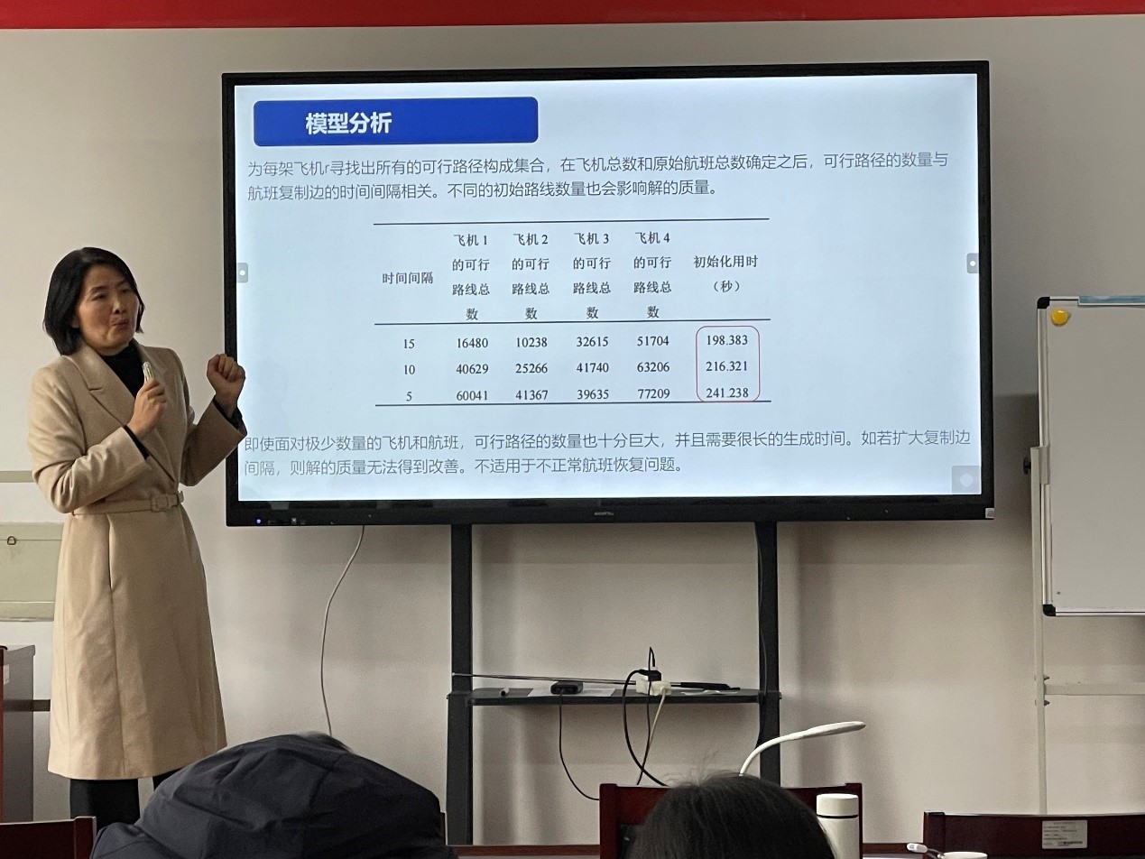 学术团队成员文杰副教授向师生们分享了考虑乘客行程安排的飞机路线恢复问题的数学模型与求解。首先将飞机路线恢复整合问题建模为一个整数规划模型,然后在Benders框架下,整数模型被分解为一个主问题和一个子问题,最后基于子问题的可行性分析,向主问题添加可以改进目标函数的最优割,并利用列生成算法求解主问题。